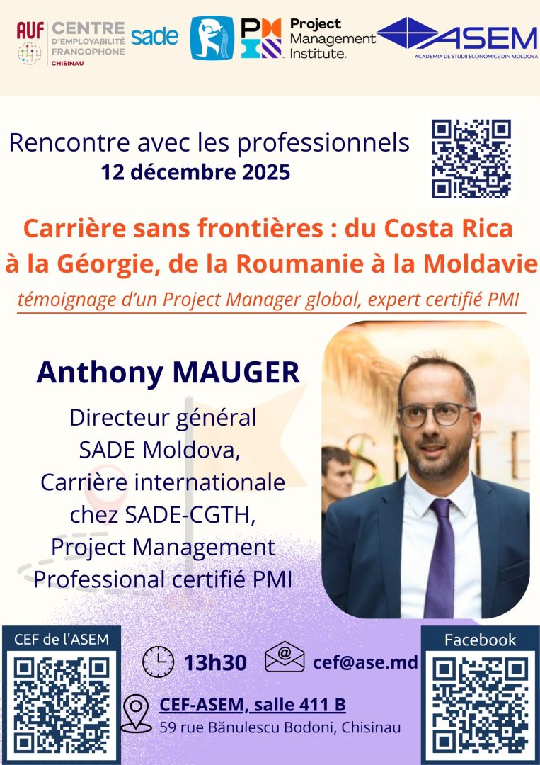 Centrul Francofon de Angajabilitate (CEF) al ASEM vă invită cordial la atelierul ”Carrière sans frontières : du Costa Rica à la Géorgie, de la Roumanie à la Moldavie”, dialog cu Anthony MAUGER, expert-manager de talie globală, Director general SADE Moldova.