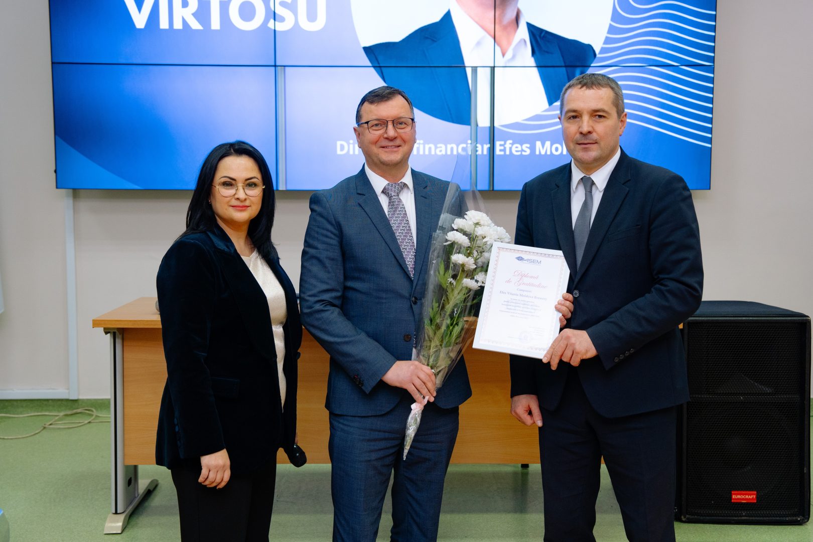 Laureații concursului „PhD Star 2025” au fost onorați cu diplome de excelență, buchete de flori și premii bănești, oferite cu generozitate de Sponsorul general al concursului Efes Moldova, o entitate autohtonă renumită, cunoscută pentru susținerea inițiativelor educaționale și de cercetare. Această colaborare reprezintă un exemplu elocvent al modului în care parteneriatele dintre mediul academic și cel economic pot contribui la încurajarea performanței și la sprijinirea tinerilor cercetători în parcursul lor profesional. Compania, fiind reprezentată de Directorul financiar, absolvent ASEM, Artur VÎRTOSU, unde în semn de înaltă apreciere pentru promovarea excelenței academice, încurajarea dezvoltării cercetării științifice şi implicarea în buna organizare a Concursului PhD Star 2025, i s-a oferit Diplomă de gratitudine.