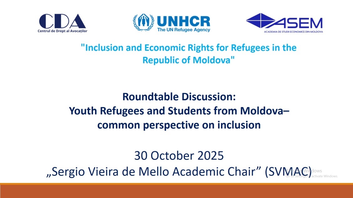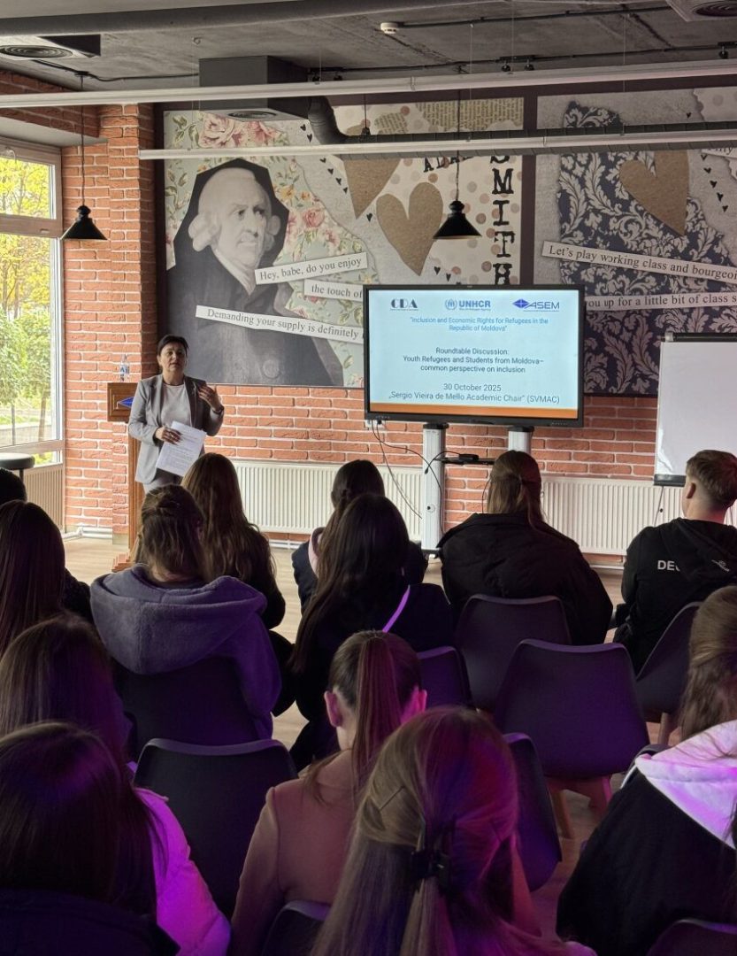 În data de 30 octombrie 2025, la ASEM s-a desfășurat Masa rotundă „Tinerii refugiați și studenții din Republica Moldova – perspective comune asupra incluziunii”. Evenimentul a avut loc în cadrul proiectului „Asistență juridică și socială a refugiaților, solicitanților de azil și persoanelor apatride din Republica Moldova”, implementat de Asociația Obștească Centrul de Drept al Avocaților, partener al Înaltului Comisariat al Națiunilor Unite pentru Refugiați (UNHCR-Moldova).