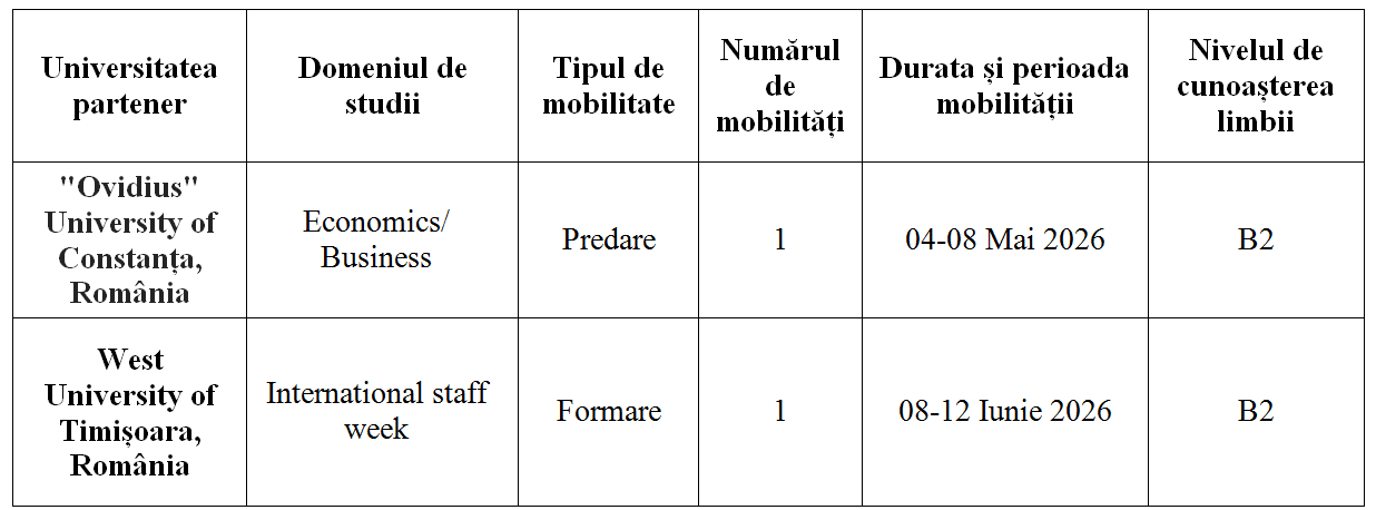 Oportunitățile de mobilitate sunt disponibile după cum urmează: