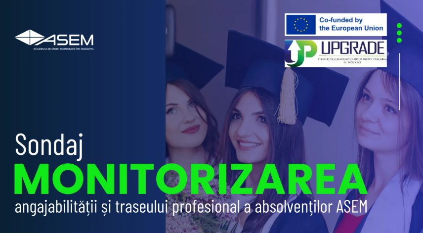Vă invităm să participați la sondajul dedicat Monitorizării angajabilității și a traseului profesional al absolvenților Academiei de Studii Economice din Moldova. Prin acest chestionar ne propunem să înțelegem mai bine experiențele voastre pe piața muncii și să identificăm modalități prin care ASEM vă poate susține în dezvoltarea parcursului profesional și creșterea satisfacției în carieră.