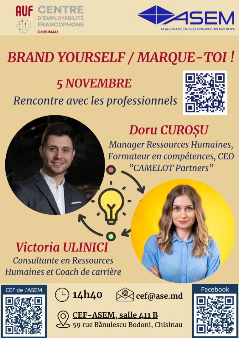 Centrul Francofon de Angajabilitate (CEF) al ASEM Vă invită cordial la atelierul de Branding Personal ”Brand Yourself / Marque-toi !”, animat în limba