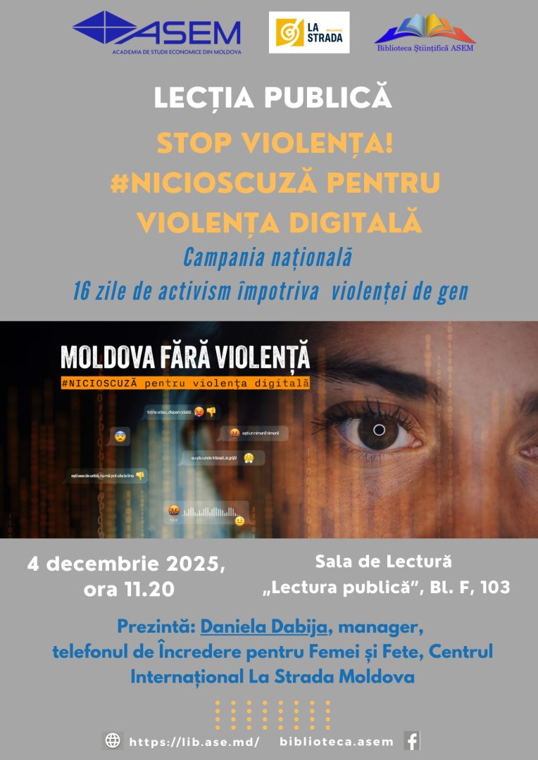 Biblioteca Științifică ASEM invită comunitatea academică și toți doritorii să participe la Lecția Publică „Stop violența! #NICIOSCUZĂ pentru violența