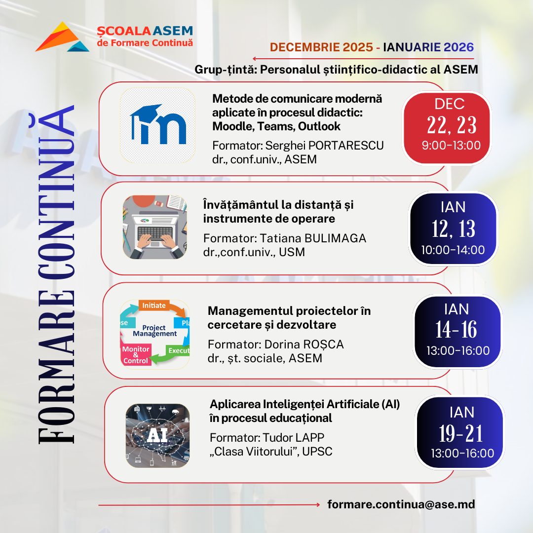 Echipa Școlii ASEM de Formare Continuă anunță Programul de instruire pentru perioada decembrie 2025 - ianuarie 2026.