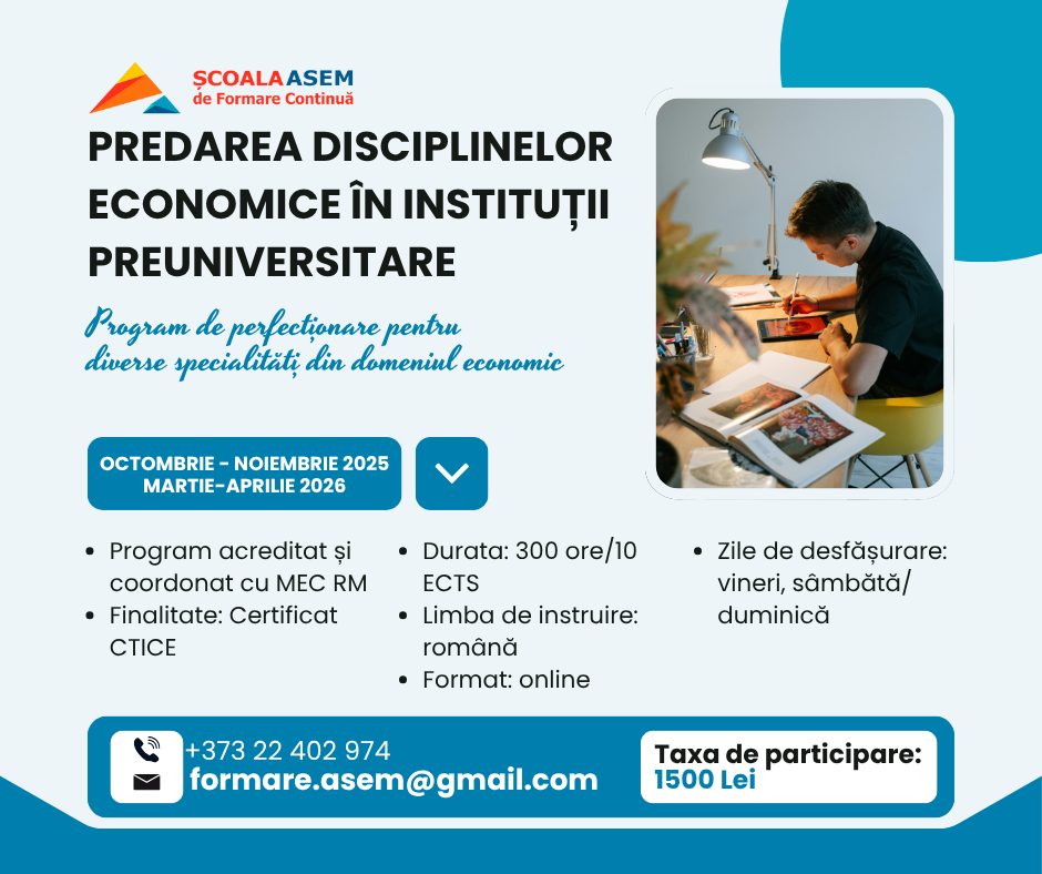 În perioada octombrie – noiembrie 2025, martie-aprilie 2026, Școala de Formare Continuă ASEM oferă cadrelor didactice oportunitatea de a participa la un program de perfecționare profesională, destinat celor care doresc să-și dezvolte competențele de predare a disciplinelor economice în învățământul preuniversitar.