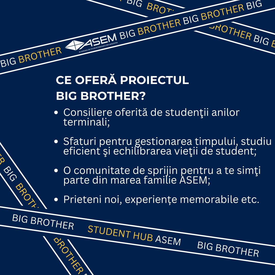 Ești la început de drum în viața universitară și cauți sprijin pentru a te adapta mai ușor? Ai întrebări despre cursuri, resurse sau cum să te integrezi în comunitatea noastră academică? Ei bine, Big Brother este aici pentru a te ghida și a-ți oferi sfaturi prețioase pe parcursul călătoriei tale universitare.