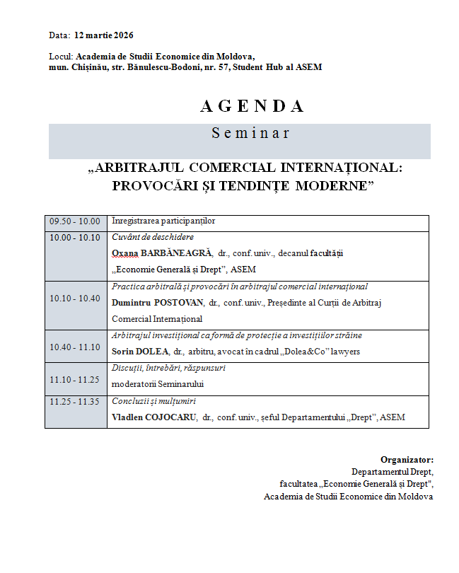 Departamentul Drept, Facultatea Economie Generală și Drept a ASEM Vă invită cordial să participați la Seminarul „Arbitrajul comercial internațional: provocări și tendințe moderne”, ce va avea loc pe data de 12 martie 2026, începând cu ora 10.00, în sala Student Hub, etaj 1, bloc B, Academia de Studii Economice din Moldova.
